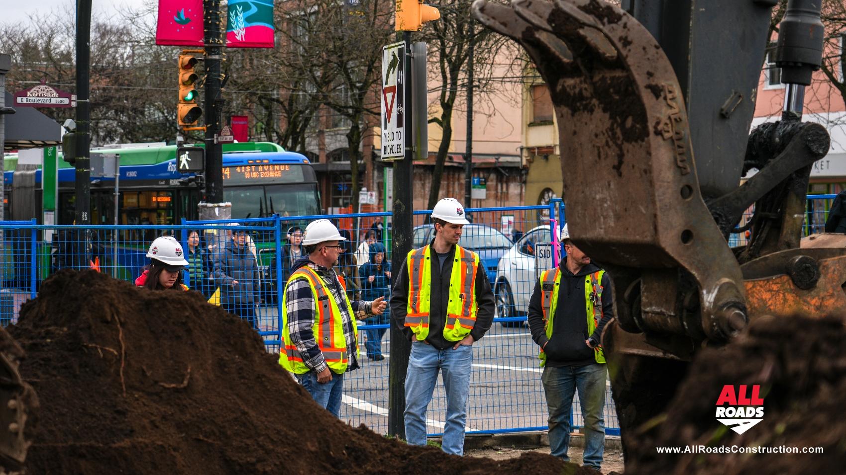 Success on this project depends on disciplined coordination between a wide network of stakeholders. All Roads works in close collaboration with subcontractors, the City of Vancouver, inspectors, Coast Mountain Bus Company, BC Hydro, TCUS safety watch personnel, and extensive traffic control teams to ensure seamless integration of all activities on site.