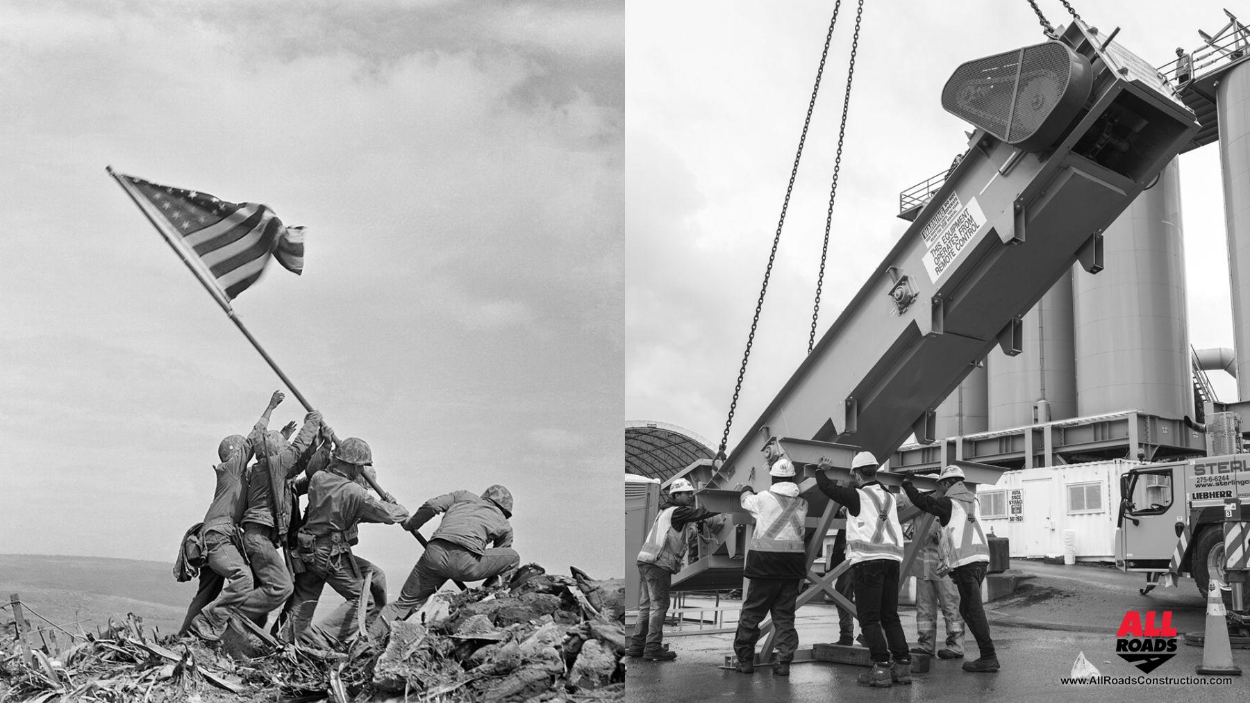That's when it happened. In a spontaneous show of grit and unity, crew members lined up and locked in under the dangling giant — reminiscent of the iconic Iwo Jima flag-raising photo. Each soaked to the core, each playing their part. It was raw, unscripted, and unforgettable.